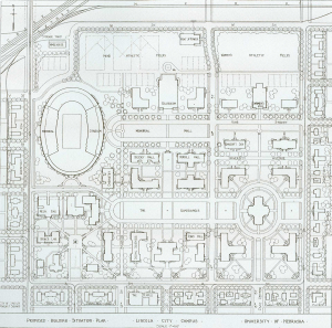 Seymour's plan was formal and included two malls running from east to west, with a smaller, north/south mall on the newly developed section of campus. The large malls were identified as The Quadrangle on the south, and Memorial Mall on the north. His plan laid the groundwork for much of the modern campus. The Malls continue to exist, although both have been compromised. The Quadrangle, developed to serve as the main axis from the east edge of the newly developed campus, to the western, older campus, was intact until the 1972 addition to the Library obscured the "vista"? that was so important to Seymour. The Memorial Mall, although never landscaped in the manner proposed by Seymour, remained intact through the middle of the century. Eventually it was converted into two surface parking lots. Other elements of the plan, such as the future placement of the Library, were the result of Seymour's plan. Most importantly, the plan anticipated the eastward expansion to 16th street, the development of Greek Row and first dormitories, and expansion to the north.